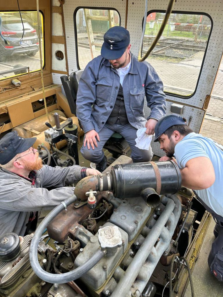 Während draußen Gleis wuchsen, wurde drinnen geschraubt. Besonders spannend war es beim Motorbahnwagen X626.106: Nach dem Wiedereinbau der Motor-Getriebe-Einheit sollte eigentlich nur die neue Kupplung getestet werden – doch dann zeigte sich ein geborstener Lager- und Zahnradschaden. Also alles wieder raus, Ersatzteile vom Spenderfahrzeug, erneut einbauen. Klingt unerquicklich, endete aber erfolgreich: Der MBW läuft wieder zur besten Zufriedenheit, und die HU kann fortgeführt werden.