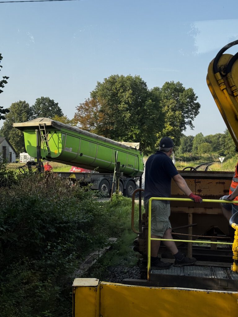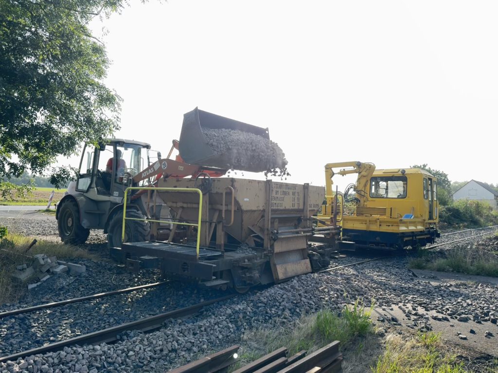 Im Sommer wurde es dann laut, staubig und schwer. Mehrere hundert Tonnen Schotter wurden angeliefert, verteilt und eingebaut. LKW-Ladungen, Schotterwagen-Fuhren, Handarbeit an den richtigen Stellen: Wer einmal gesehen hat, wie 62 Schotterwagenladungen an nur einem Tag gezielt ins Gleis gebracht werden, weiß, warum man danach müde, aber zufrieden ist.